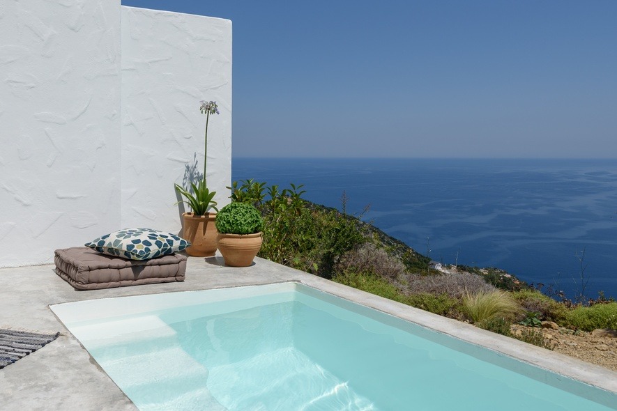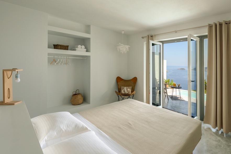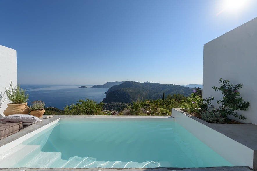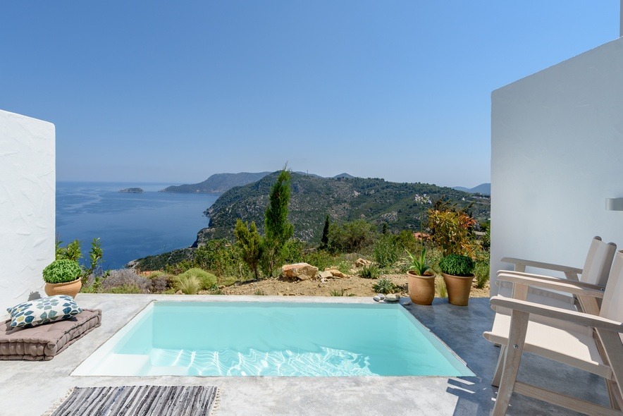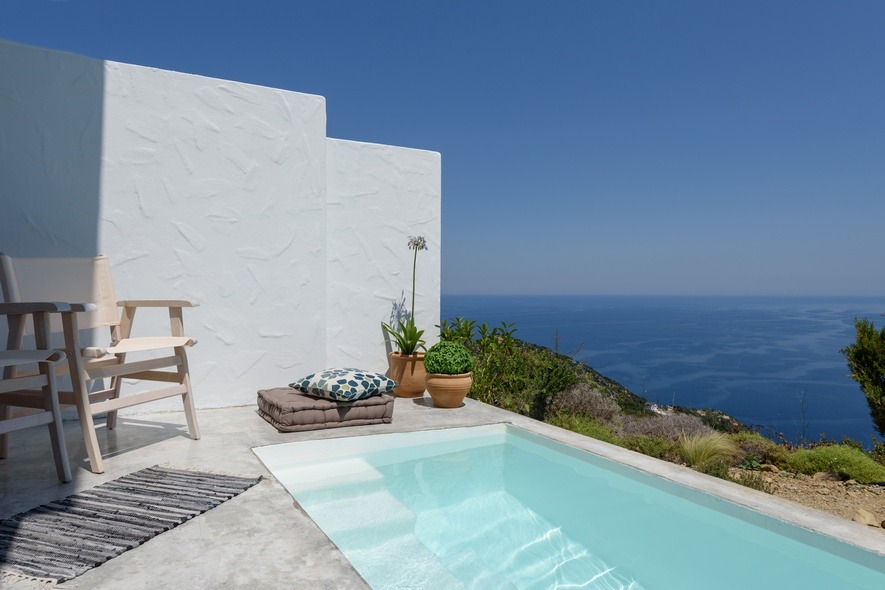 To Deluxe δωμάτιο, 26 τ.μ., παρέχει μία εξωτερική ιδιωτική mini πισίνα με υδρομασάζ σε μία ευρύχωρη βεράντα που προσφέρει εκπληκτική πανοραμική θέα στο Αιγαίο, ιδανική επιλογή για κείνους που επιθυμούν στιγμές χαλάρωσης και γαλήνης.